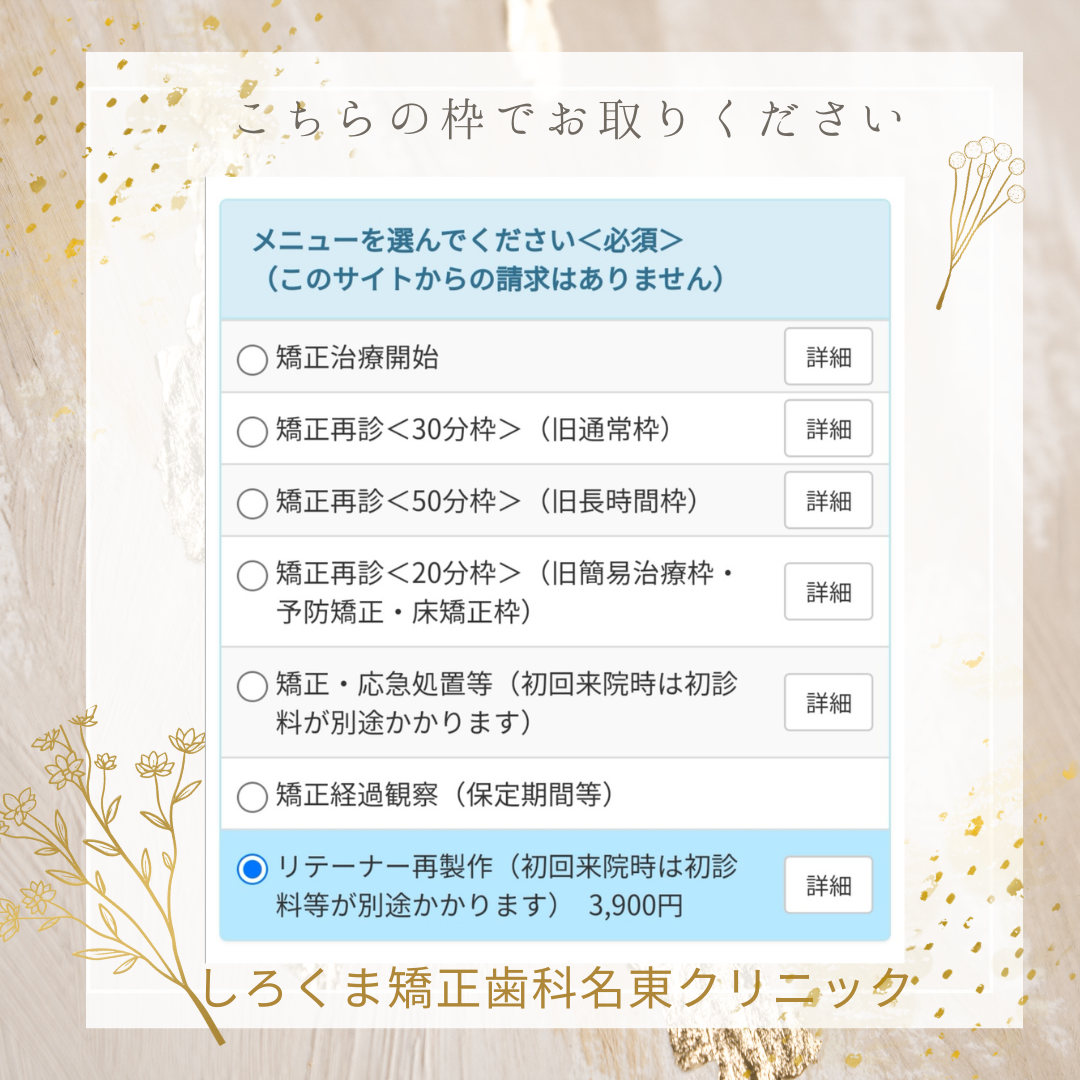 リテーナー再制作という予約項目でご予約をお取りください。